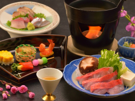 飛騨牛ミニステーキ、金目鯛しゃぶしゃぶ、鰆たたきを含むお造り盛合せなどが楽しめるレストラン食プラン