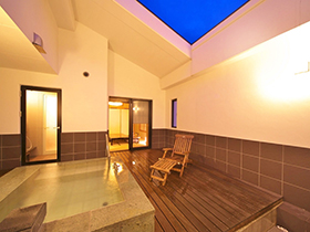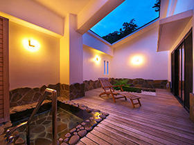 坪庭を眺めながらご利用いただく「源泉掛け流し」の露天風呂付客室(和洋室)です。