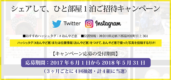 おんやど恵に宿泊し、ハッシュタグ「#おんやど恵」または位置情報をつけてInstagramまたはTwitterに投稿した方の中から、抽選で1名様に「おんやど恵 1泊ご招待(ひと部屋:1〜4名様まで)」をプレゼントいたします。 当選者には投稿したSNSのDM機能で連絡いたします。必ず onyadomegumi のアカウントをフォローしてお待ちください。応募期間:2017年6月1日〜2018年5月31日。